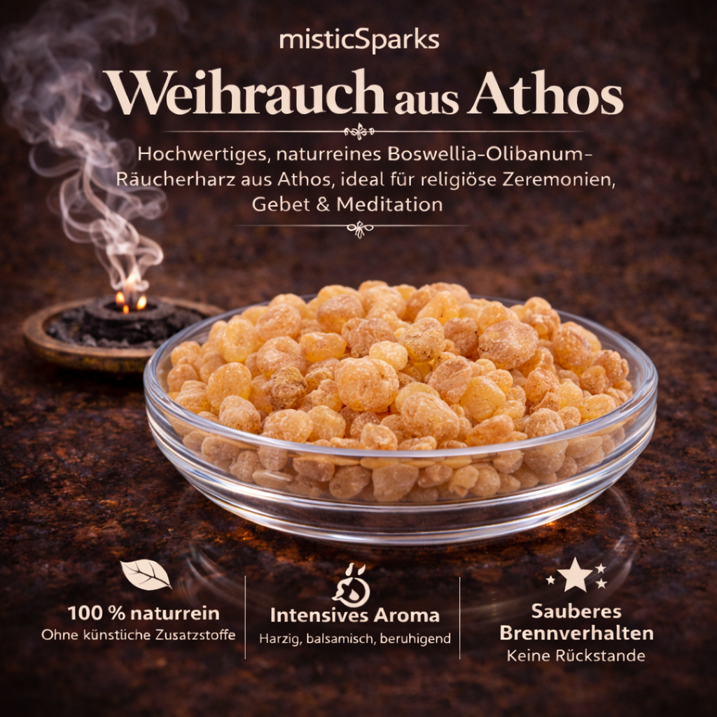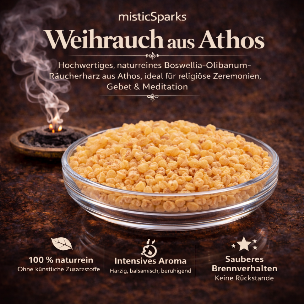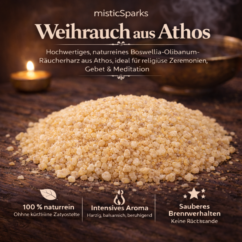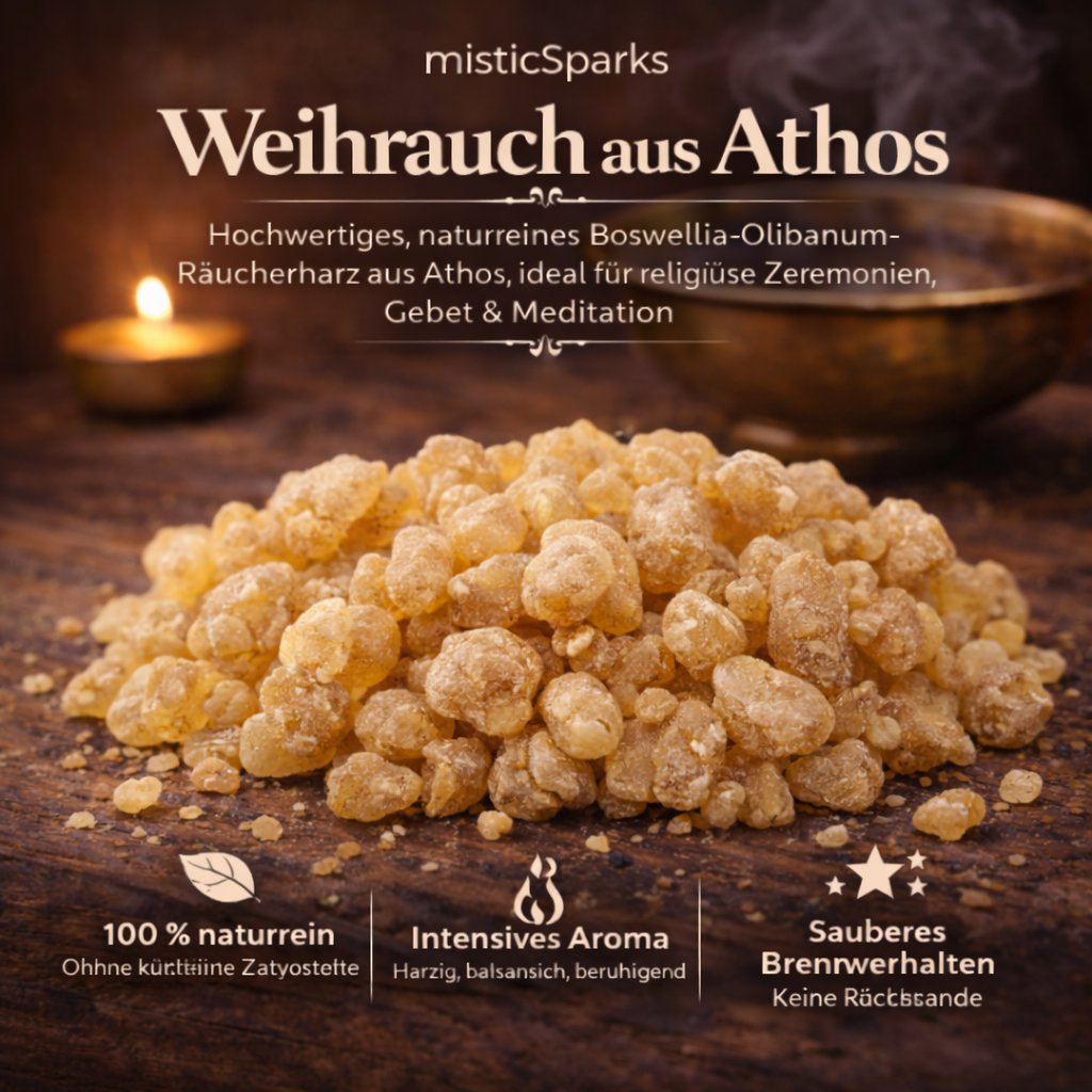 misticSparks bietet sorgfältig ausgewählten Weihrauch aus Athos in 100 % naturreiner Qualität – ohne künstliche Zusätze, ohne synthetische Duftstoffe und ohne chemische Aromen.