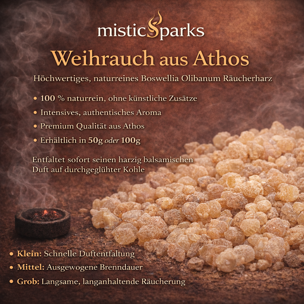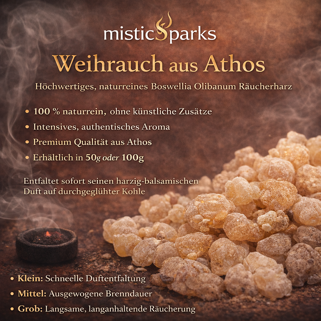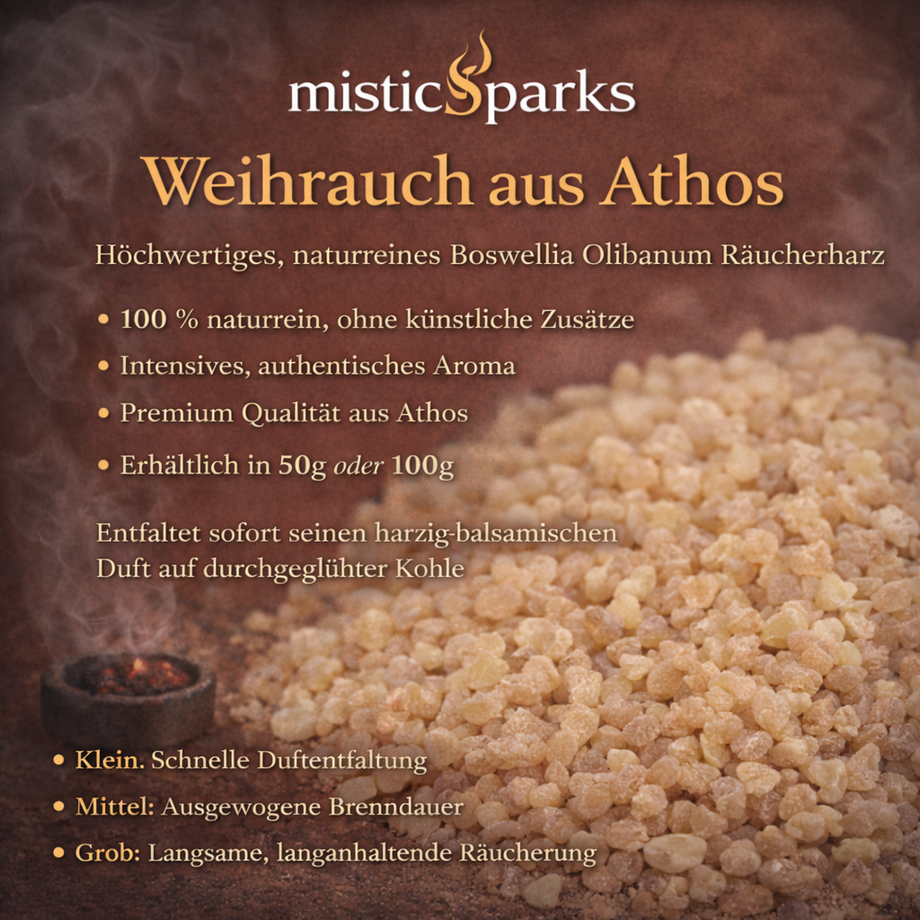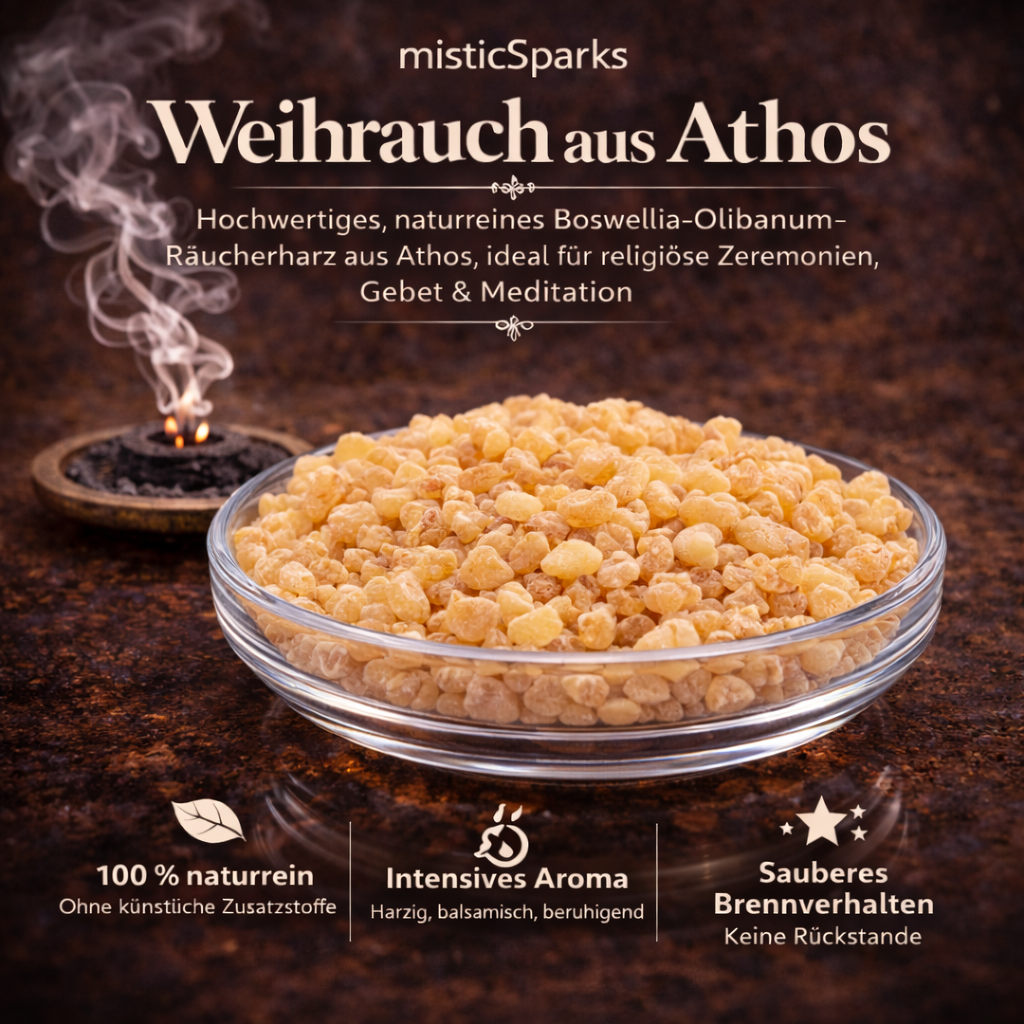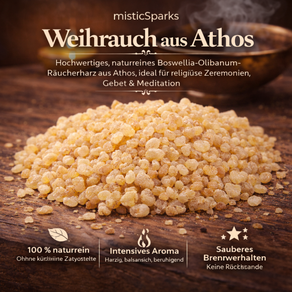 misticSparks bietet sorgfältig ausgewählten Weihrauch aus Athos in 100 % naturreiner Qualität – ohne künstliche Zusätze, ohne synthetische Duftstoffe und ohne chemische Aromen.